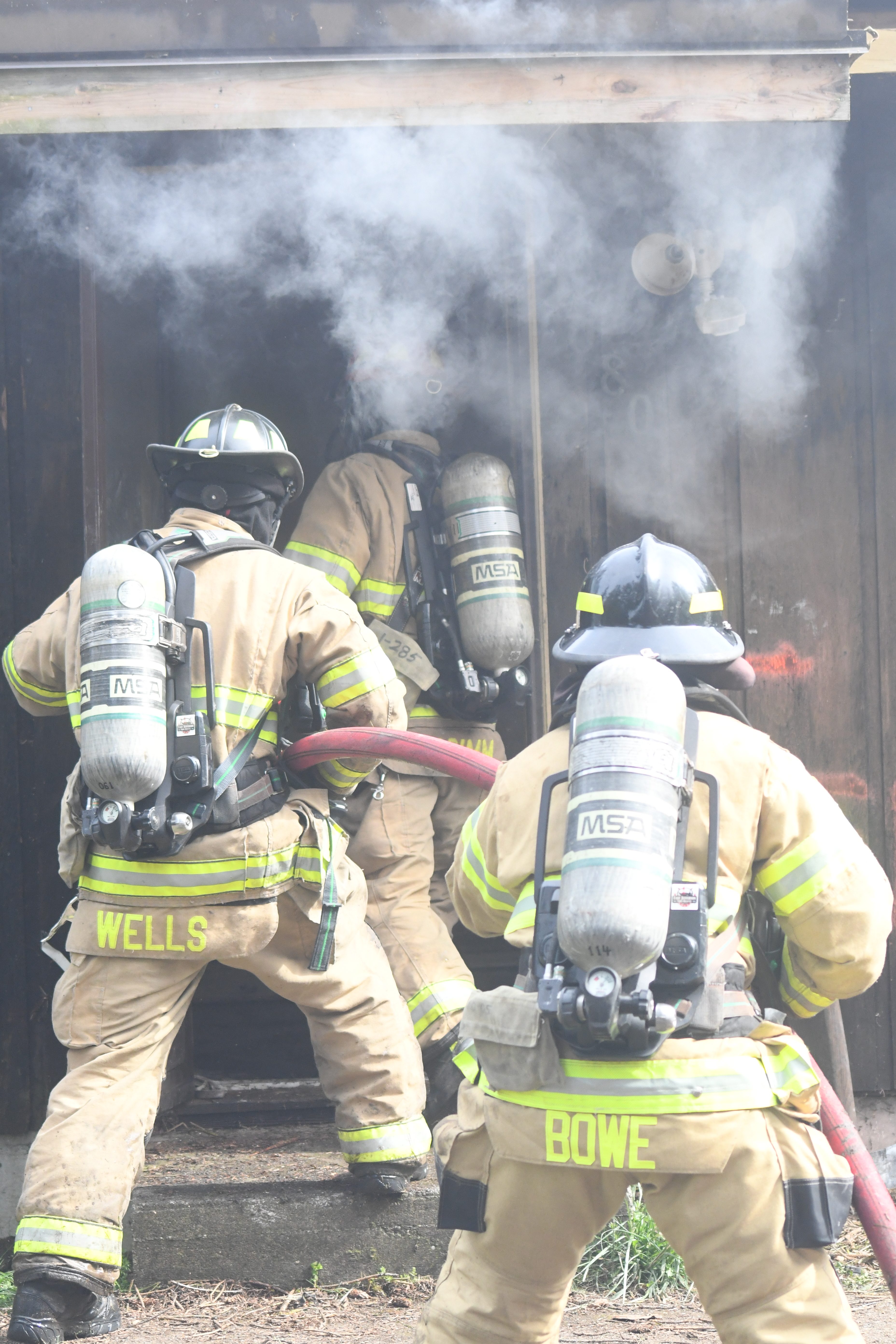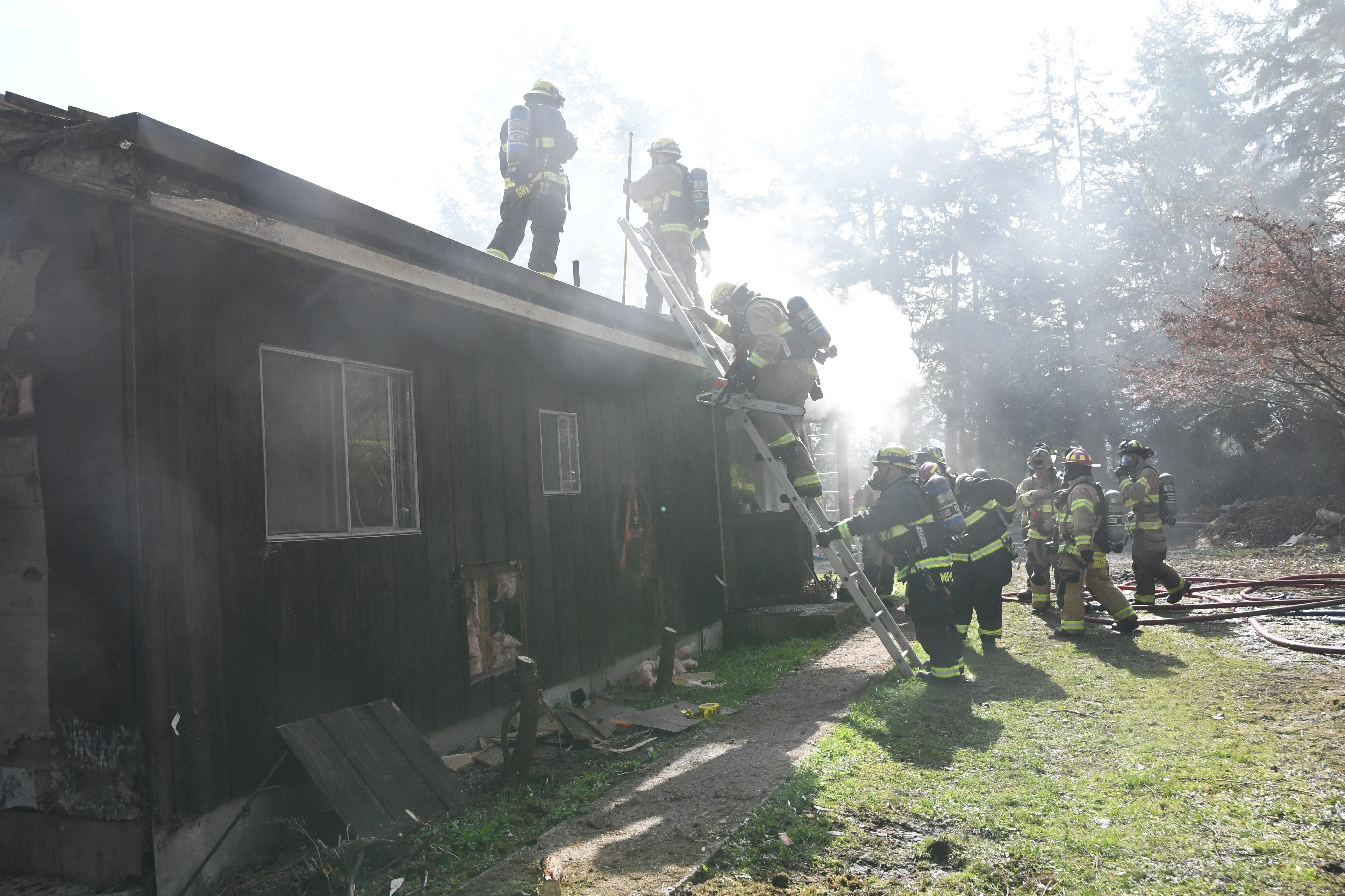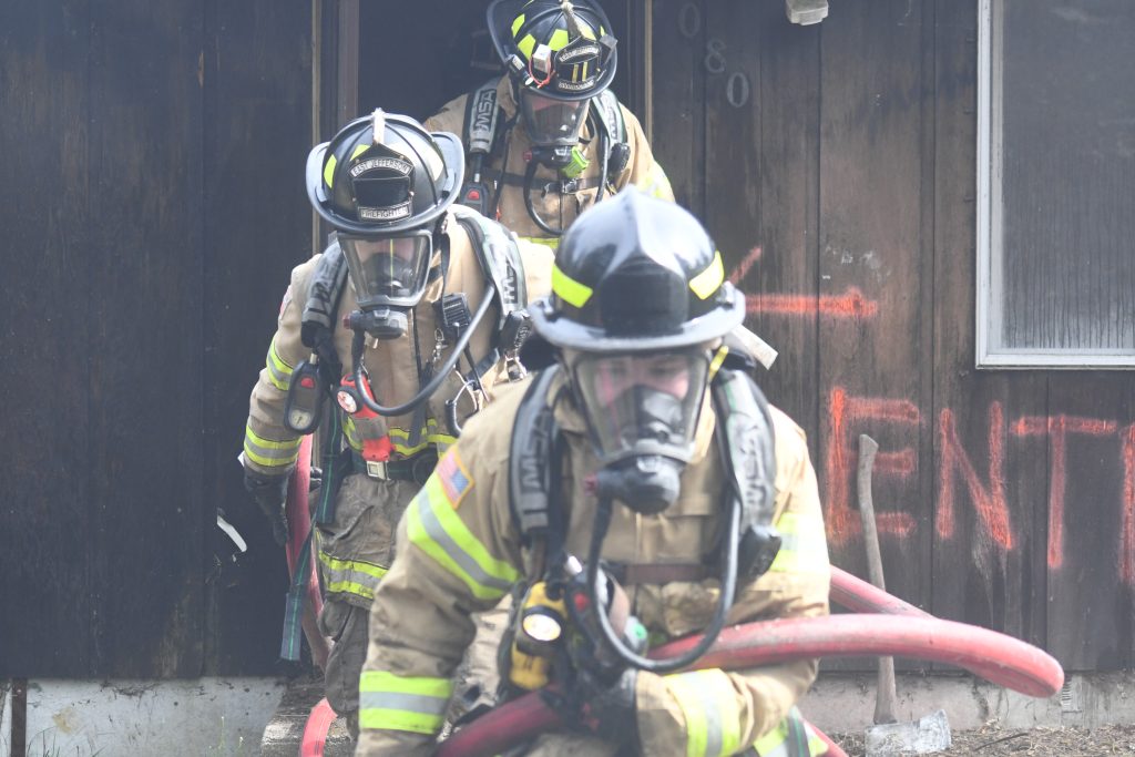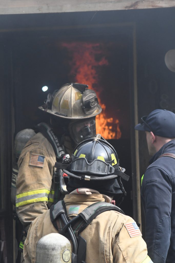 Training included search and rescue, fire hose deployment, incident size up, ground ladder deployments, rapid intervention training (RIT), wall, window, and door breaching, and cutting ventilation holes in walls and roof. The final day included live fire training with repetitive ignition and suppression of controlled fires in various rooms as well as interpreting interior fire behavior. A final full burn of the structure without suppression completed the training.