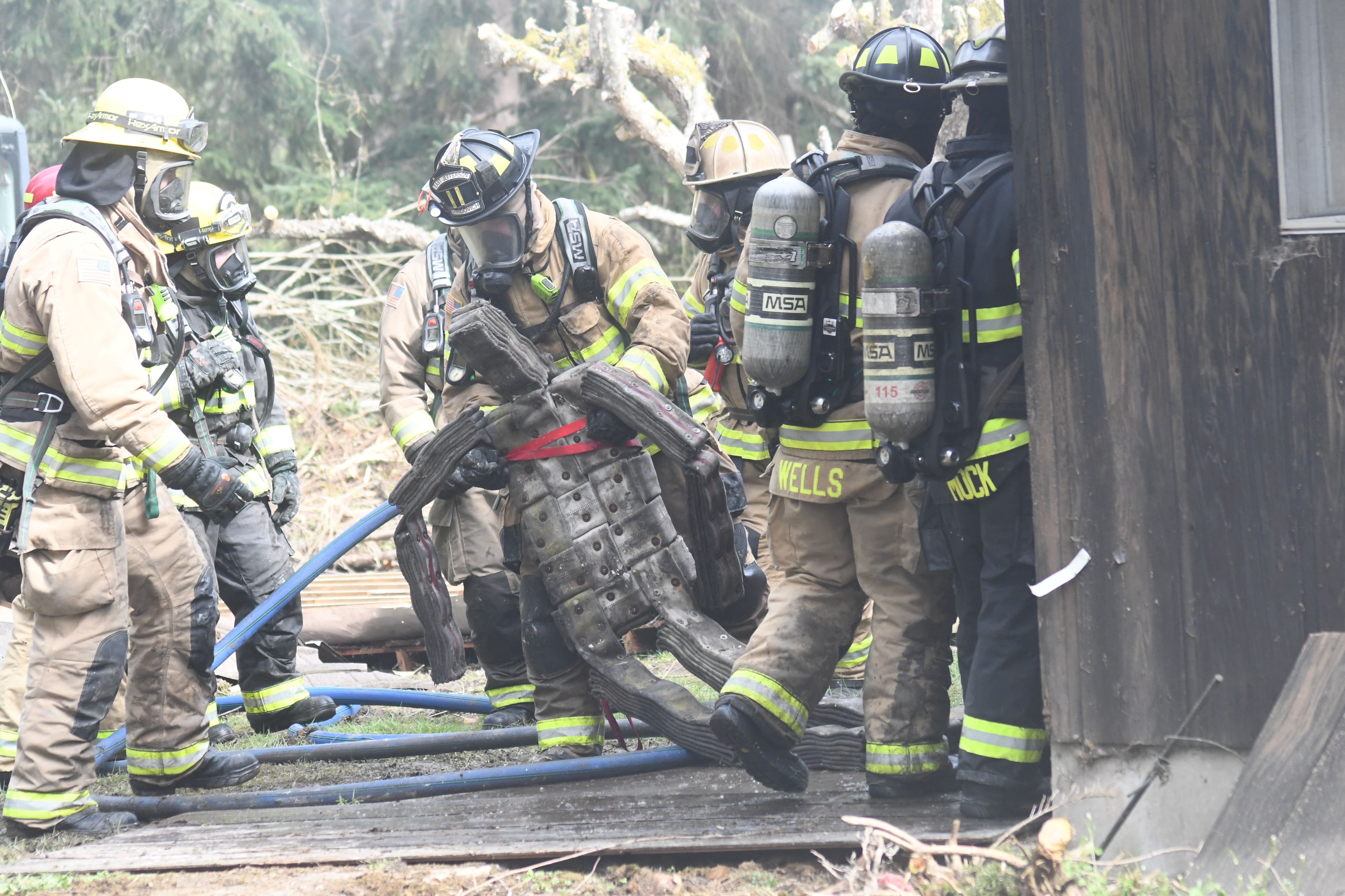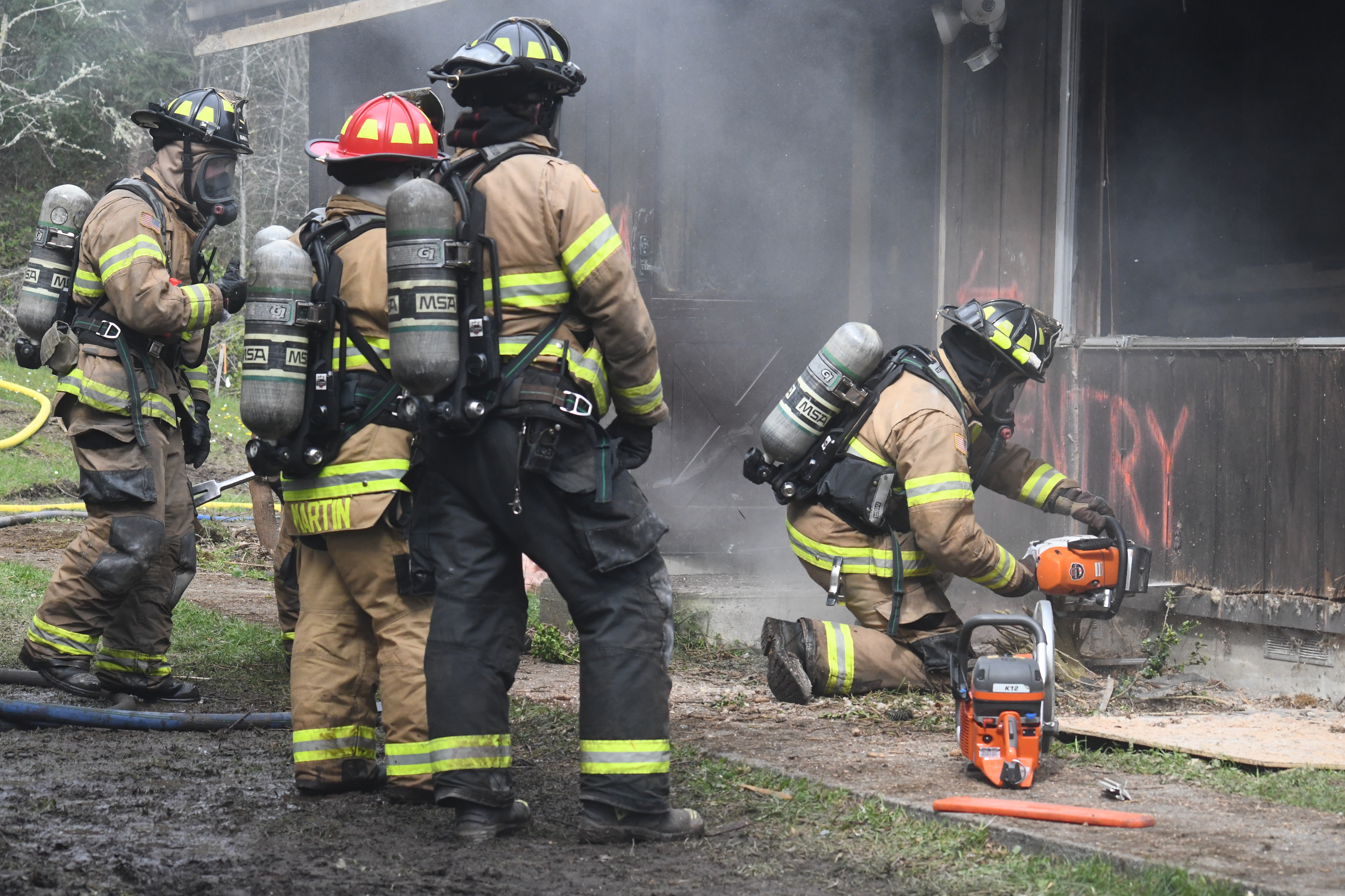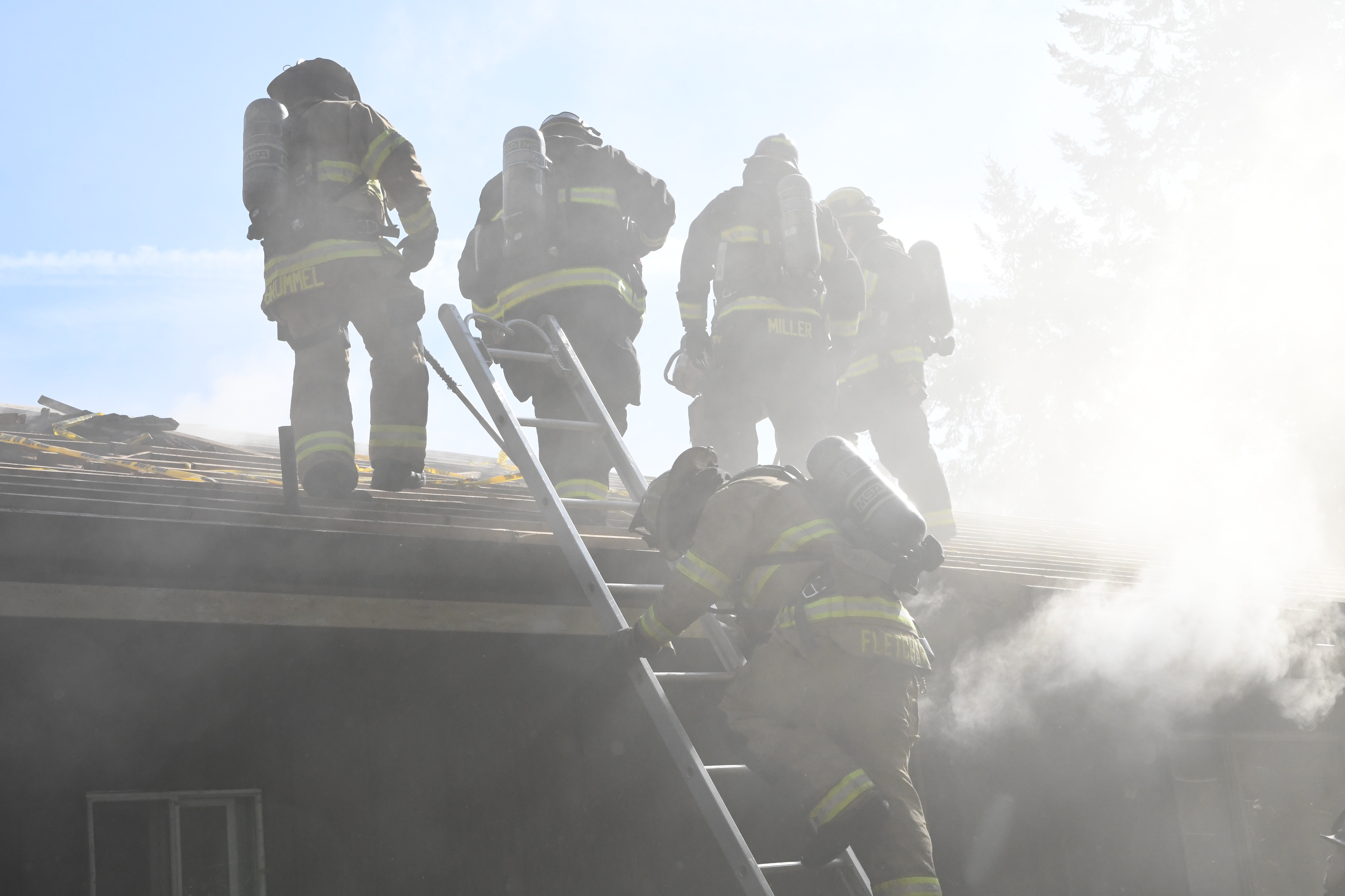 Training included search and rescue, fire hose deployment, incident size up, ground ladder deployments, rapid intervention training (RIT), wall, window, and door breaching, and cutting ventilation holes in walls and roof. The final day included live fire training with repetitive ignition and suppression of controlled fires in various rooms as well as interpreting interior fire behavior. A final full burn of the structure without suppression completed the training.