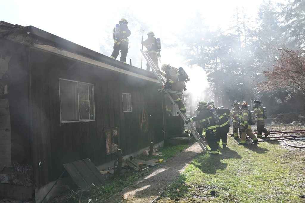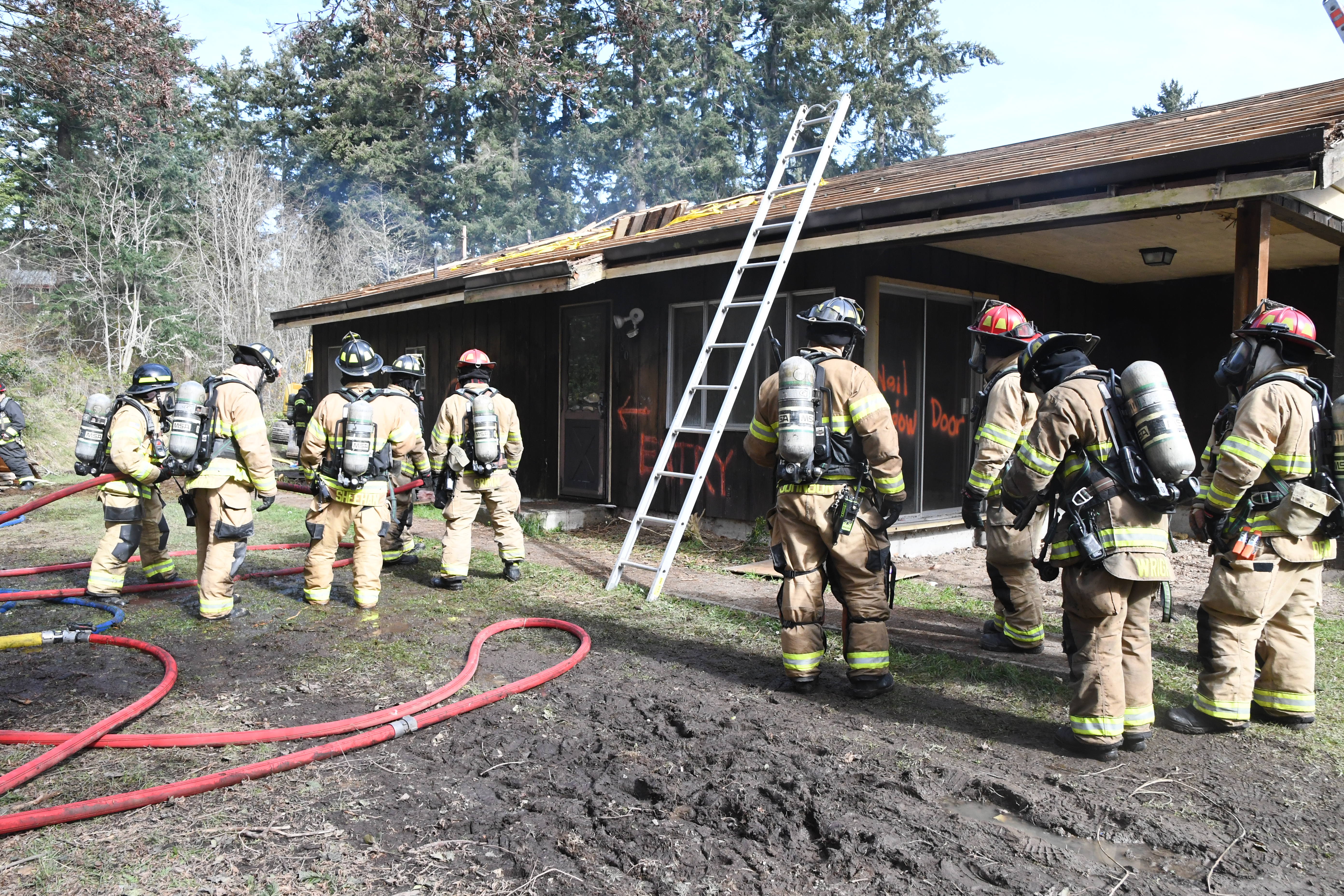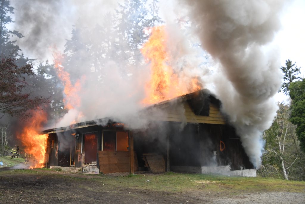 Firefighters are required to maintain live fire training credentialing every three years per National Fire Protection Association (NFPA) 1001 Standard for Fire Fighter Professional Qualifications and WAC 296-305 Safety Standards for Firefighters. EJFR typically utilizes our Fire Training Center at Station 2 on Jacob Miller Road in Port Townsend for annual training for one of three rotating shifts each year. Our training center is equipped with metal shipping containers where small fires are used to reinforce hose deployment and fire suppression technique training. These containers are durable, but do not reflect a standard home or business structure very well.
